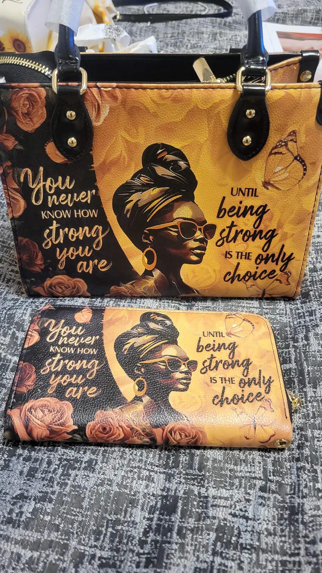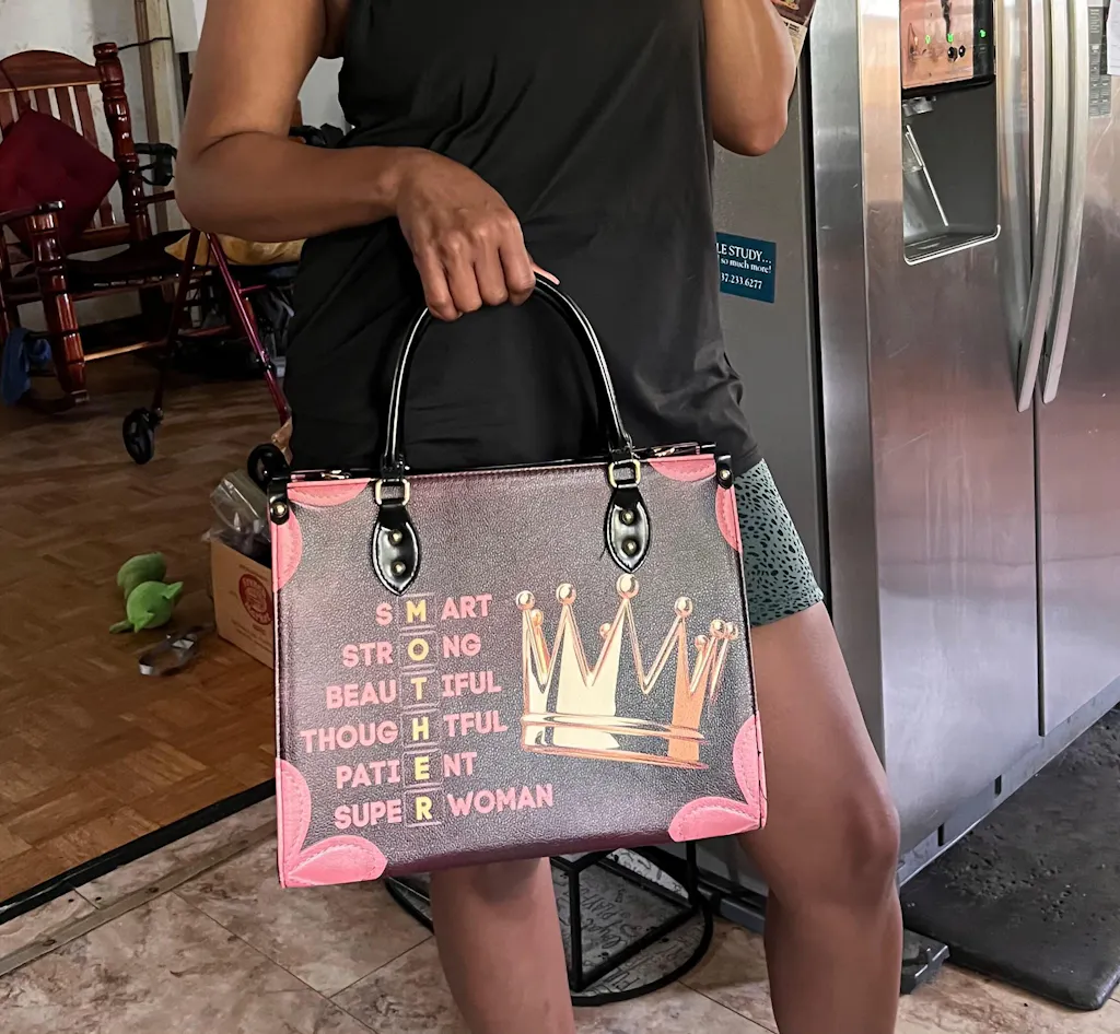 This bag features powerful words—Smart, Strong, Beautiful, Thoughtful, Patient, Superwoman—all forming the word MOTHER. It represents the multifaceted role of Black mothers, who balance strength with compassion and wisdom with warmth. The regal gold crown symbolizes the undeniable power and worth of every Black mom.